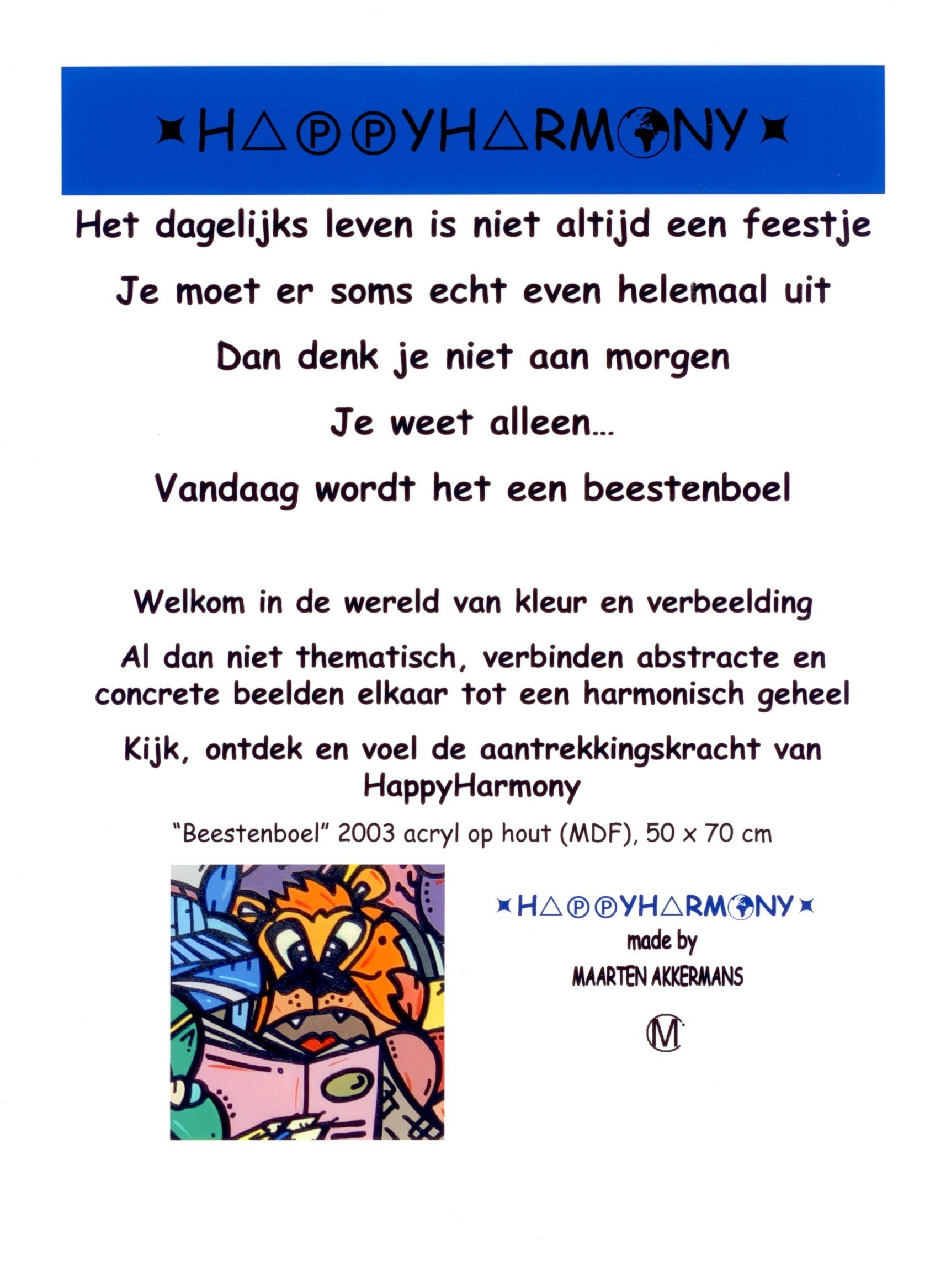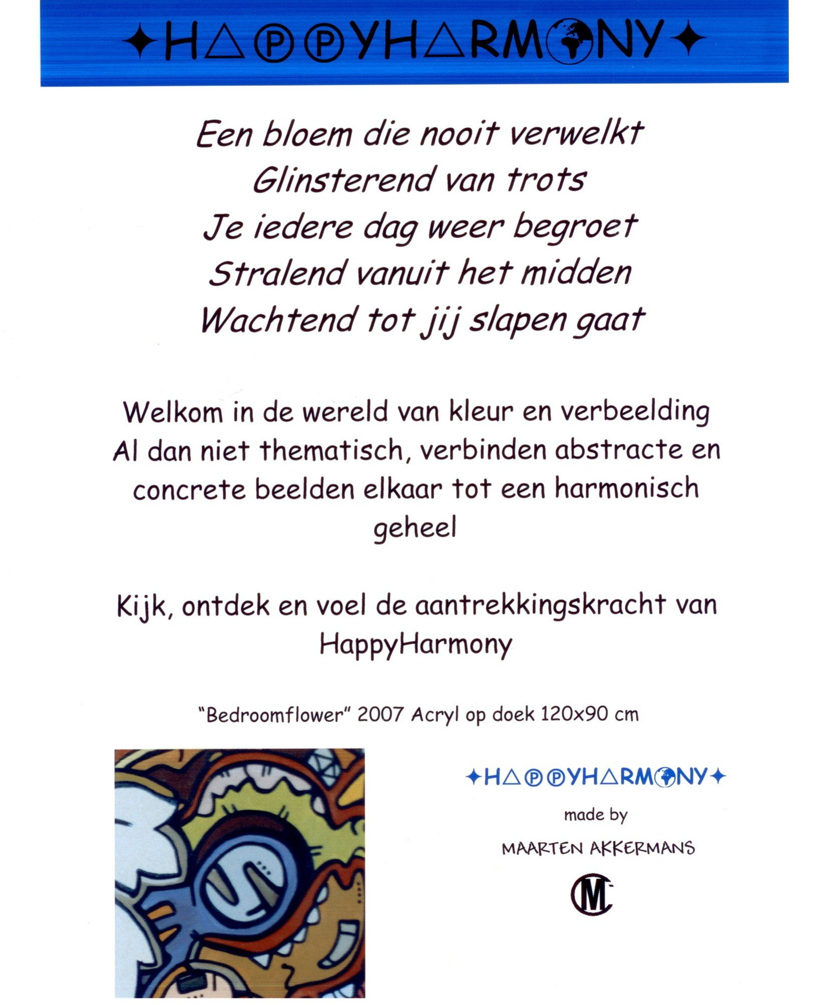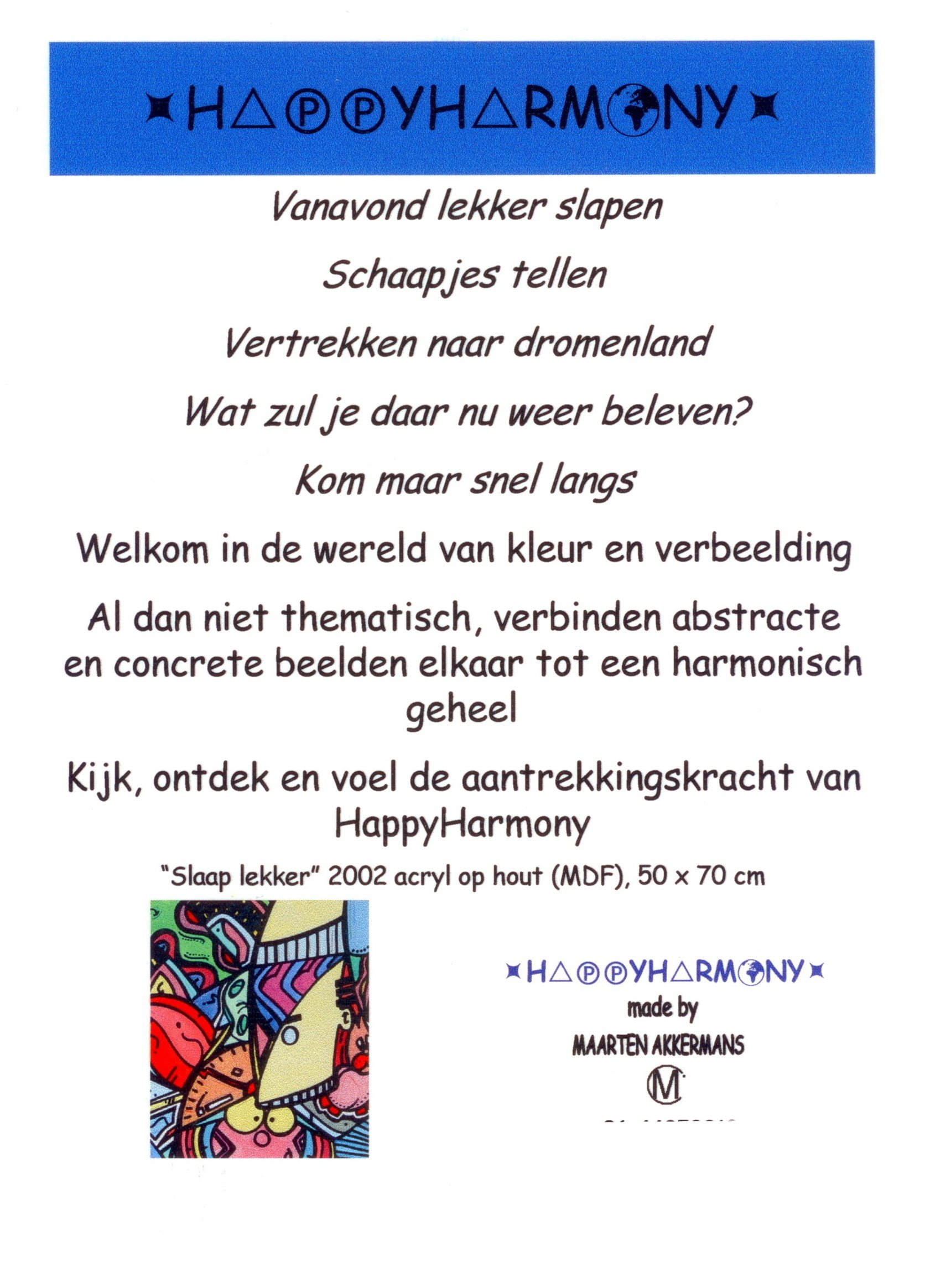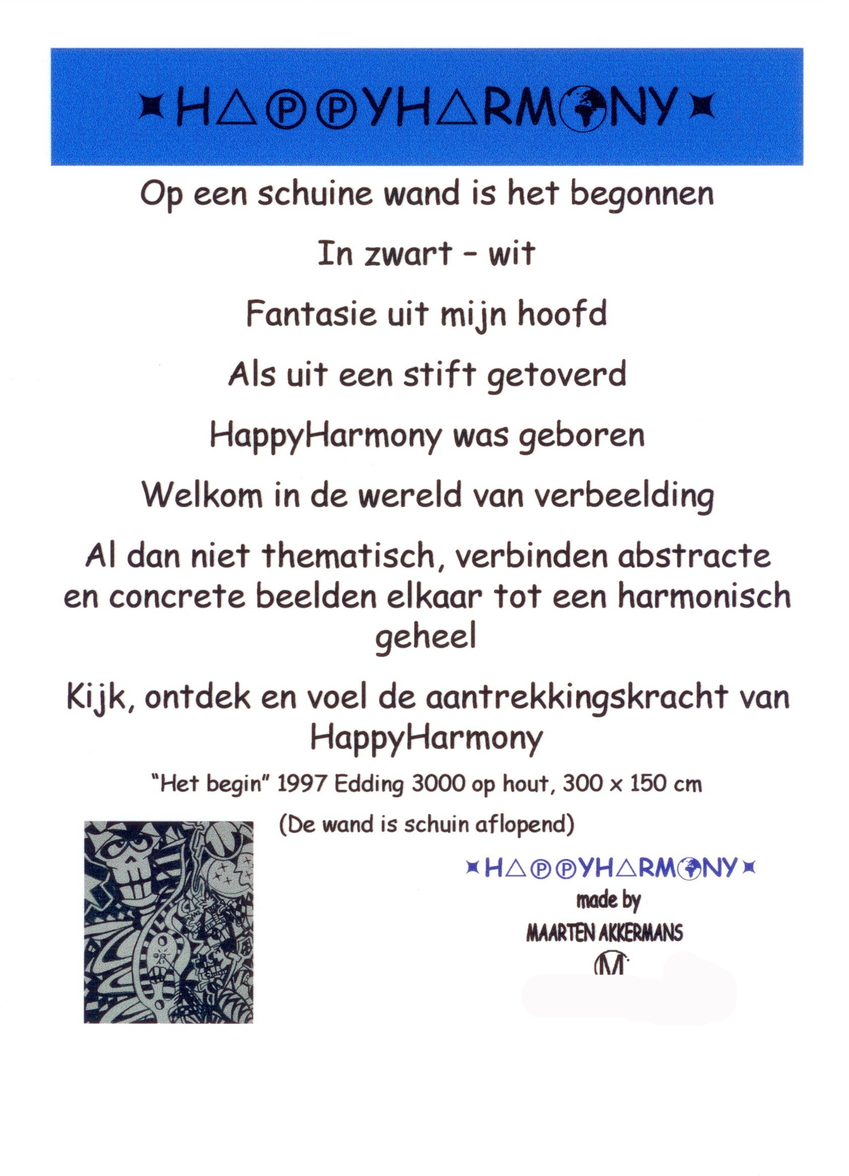 Van kleins af aan heb ik heel wat kilometers getekend en geschilderd. Op mijn zolderkamer had ik een behoorlijke grote witte, schuine wand. Ik zou en moest er iets mee. Onder het genot van melodische trancemuziek, ben ik zonder voorbeeld aan de slag gegaan. Puur op fantasie, het gevoel van dat moment, opgezweept door heerlijke muziek. Als uit een stift getoverd, was HappyHarmony geboren.