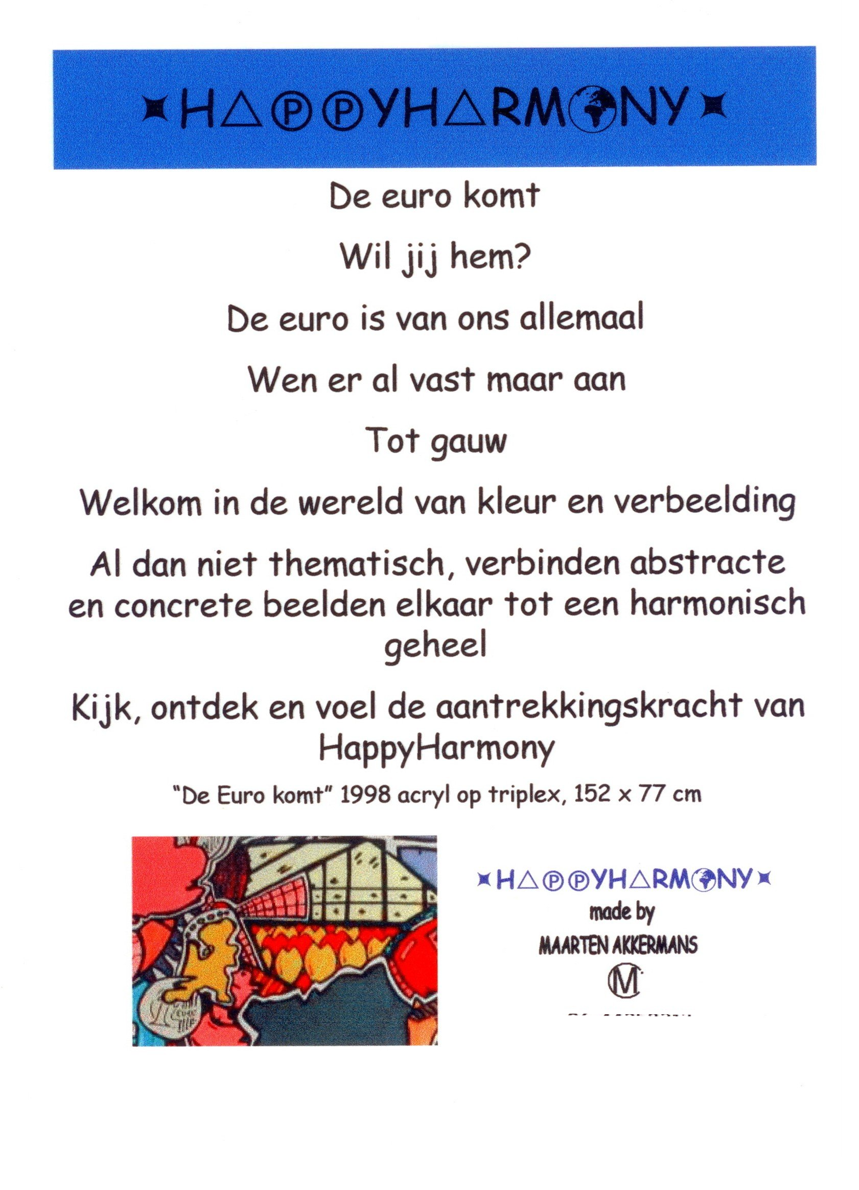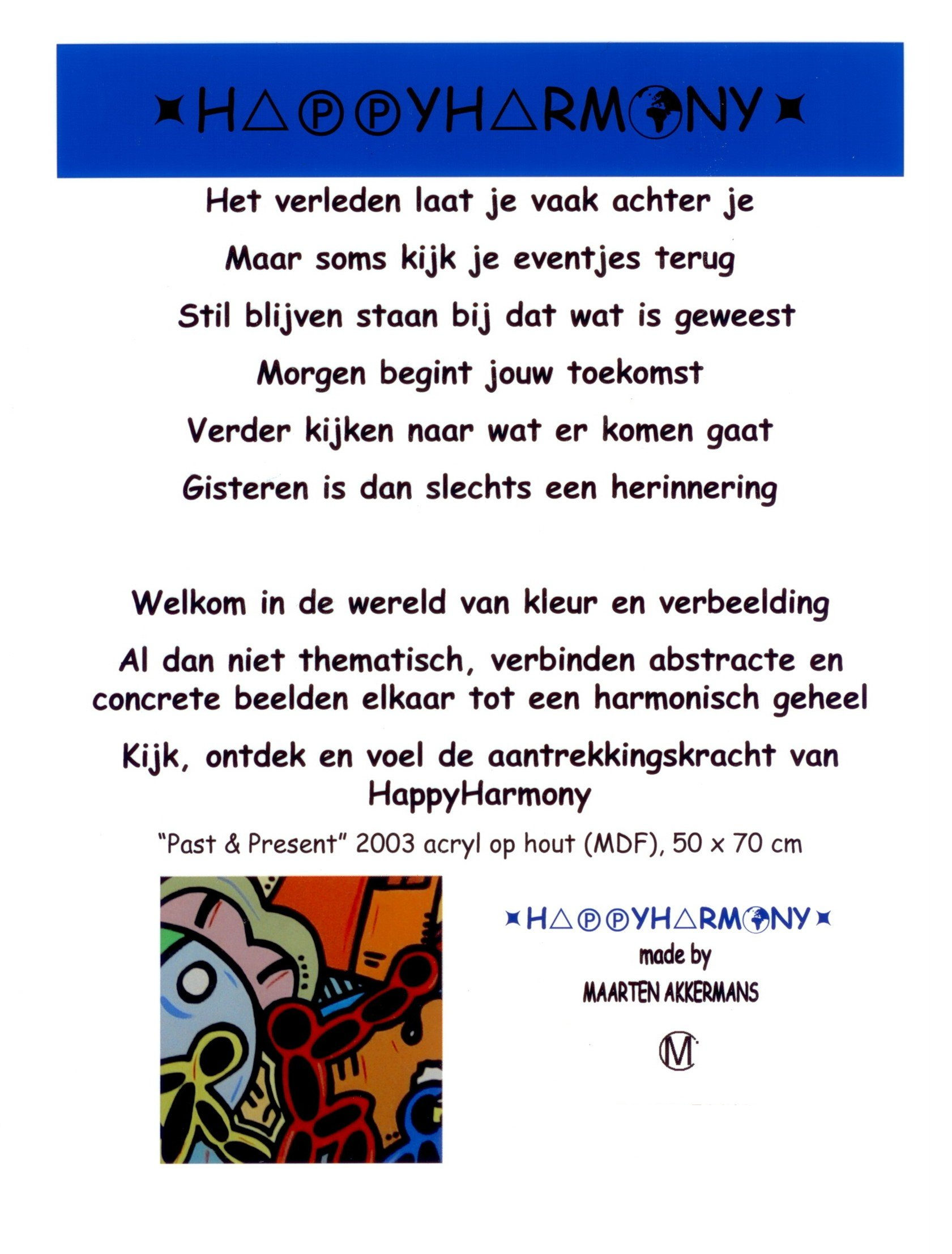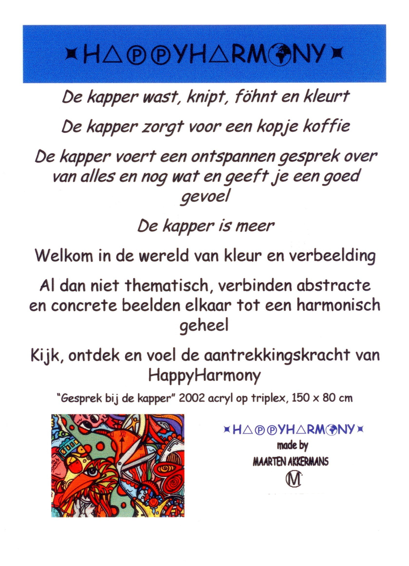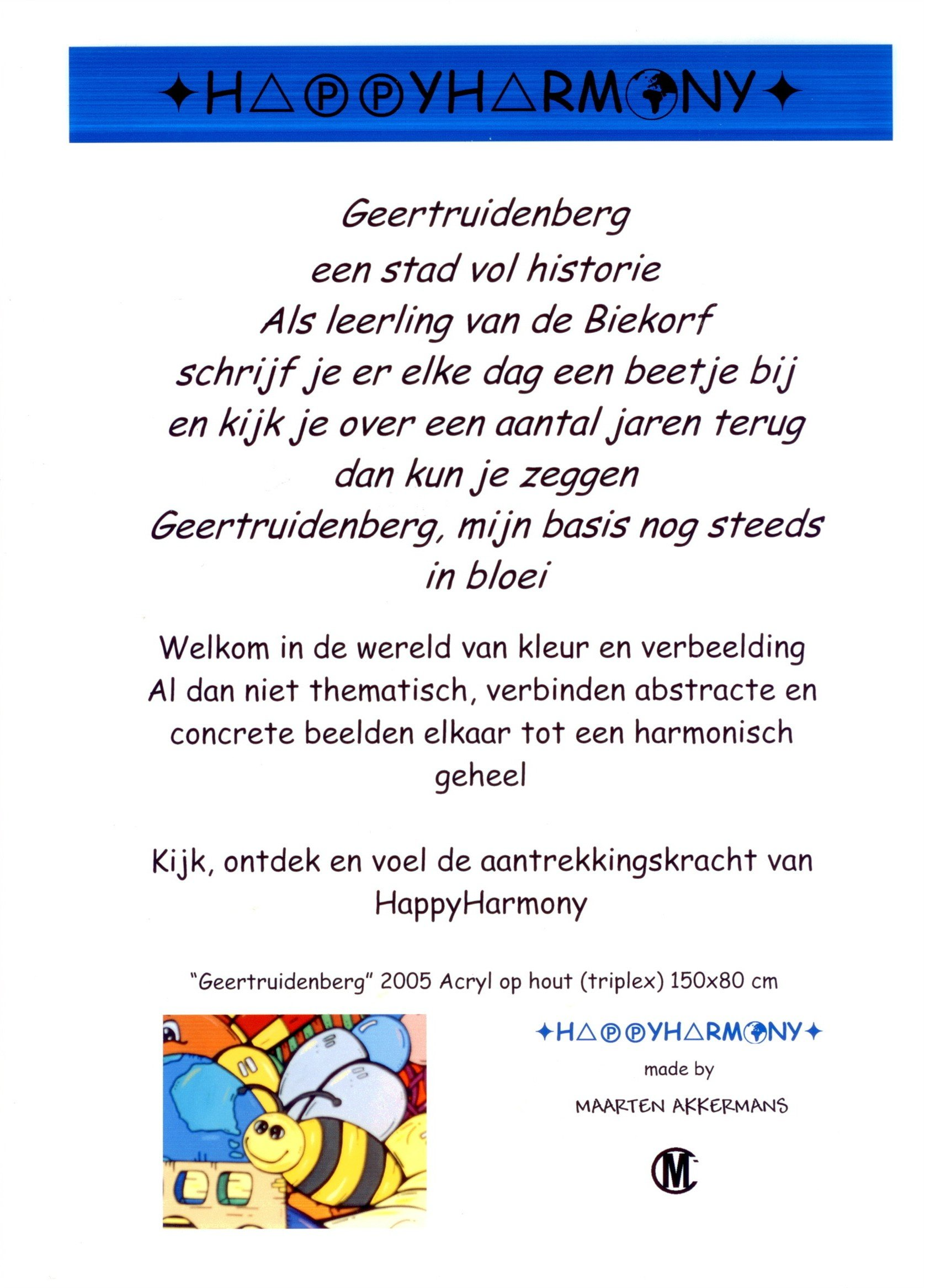Van kleins af aan heb ik heel wat kilometers getekend en geschilderd. Op mijn zolderkamer had ik een behoorlijke grote witte, schuine wand. Ik zou en moest er iets mee. Onder het genot van melodische trancemuziek, ben ik zonder voorbeeld aan de slag gegaan. Puur op fantasie, het gevoel van dat moment, opgezweept door heerlijke muziek. Als uit een stift getoverd, was HappyHarmony geboren.