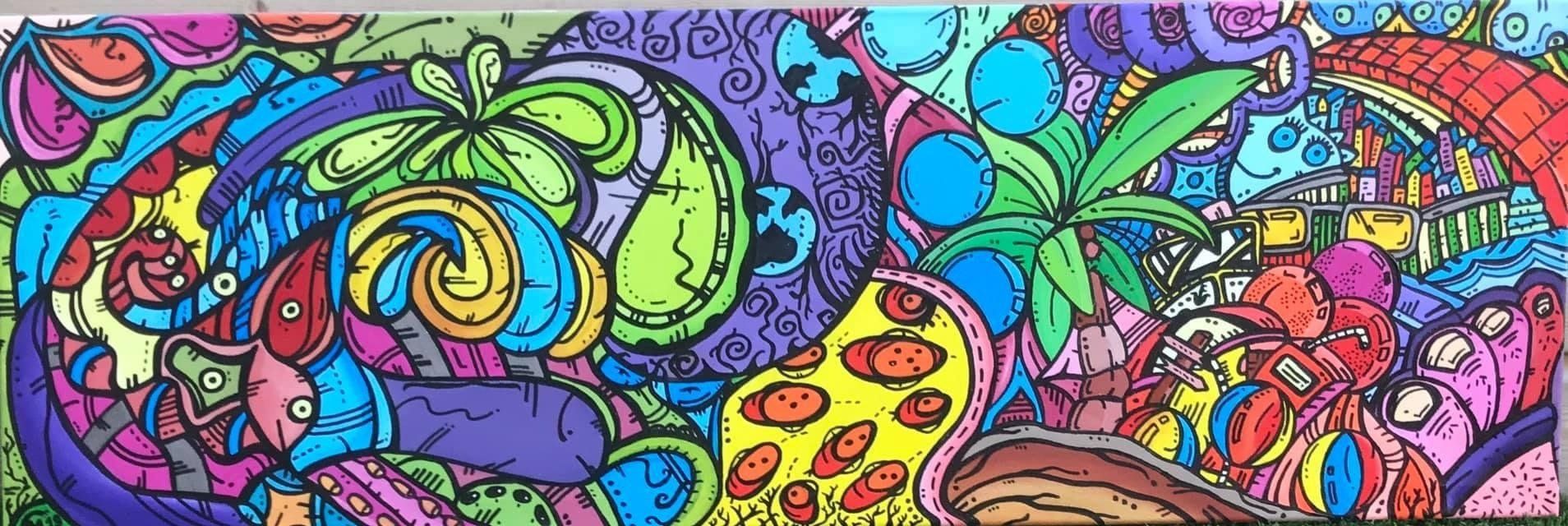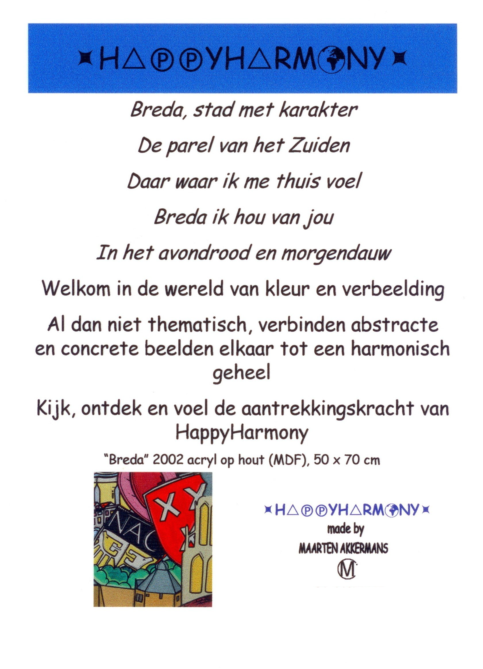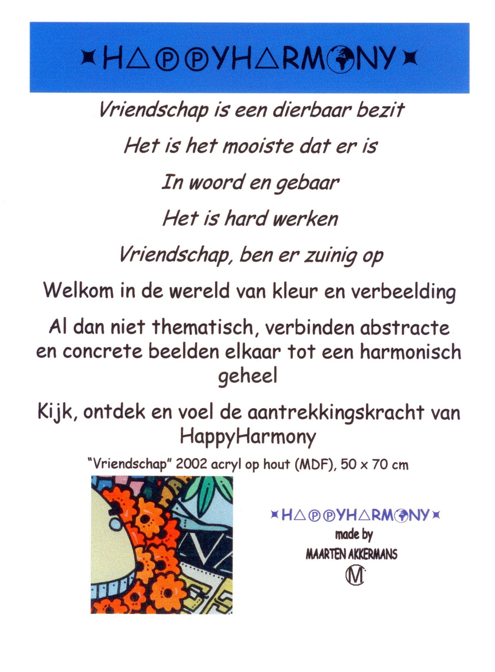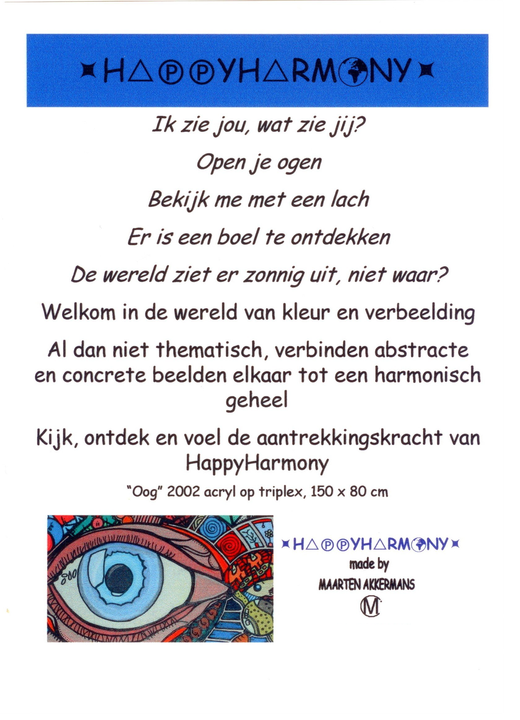 Van kleins af aan heb ik heel wat kilometers getekend en geschilderd. Op mijn zolderkamer had ik een behoorlijke grote witte, schuine wand. Ik zou en moest er iets mee. Onder het genot van melodische trancemuziek, ben ik zonder voorbeeld aan de slag gegaan. Puur op fantasie, het gevoel van dat moment, opgezweept door heerlijke muziek. Als uit een stift getoverd, was HappyHarmony geboren.