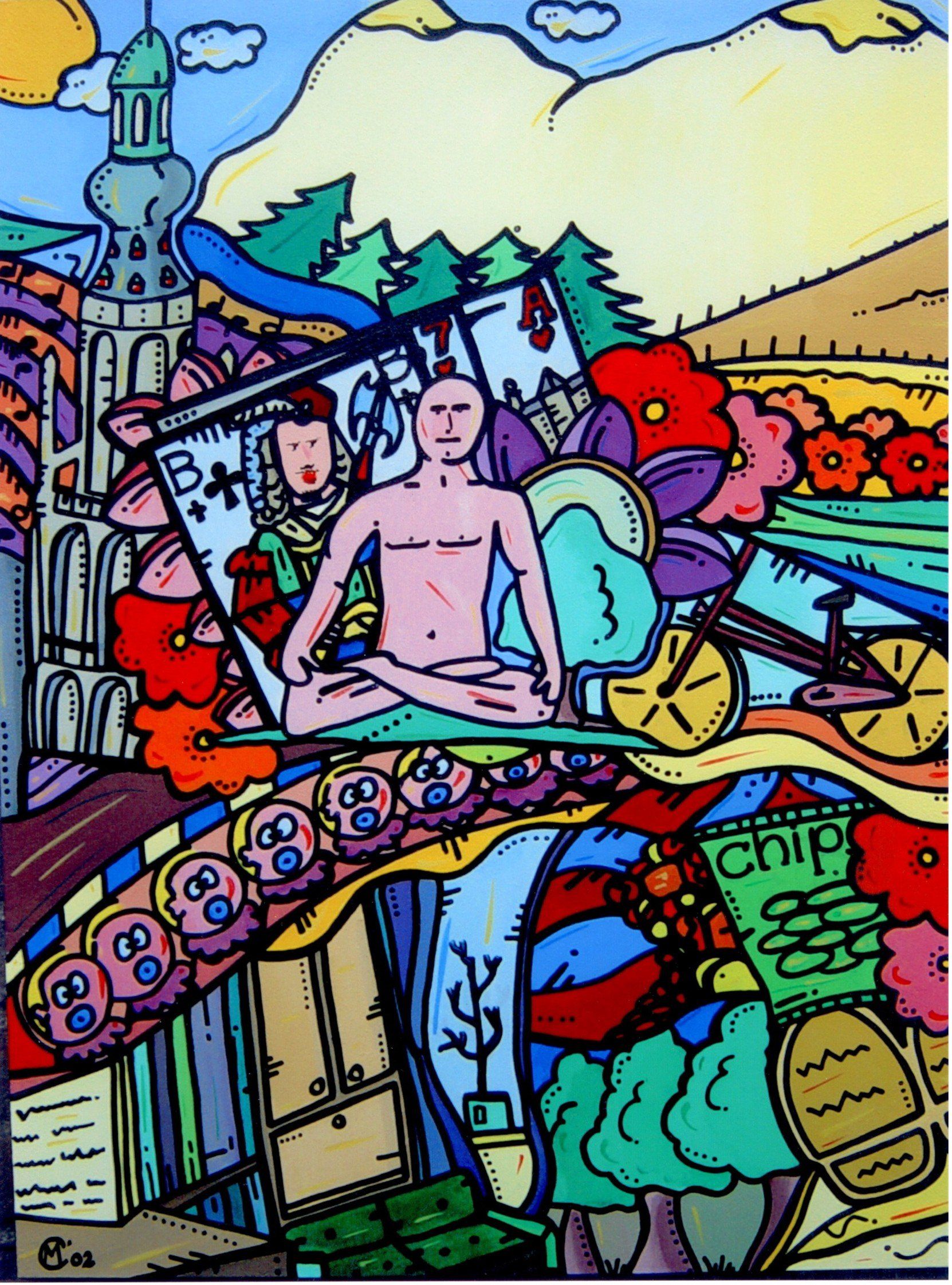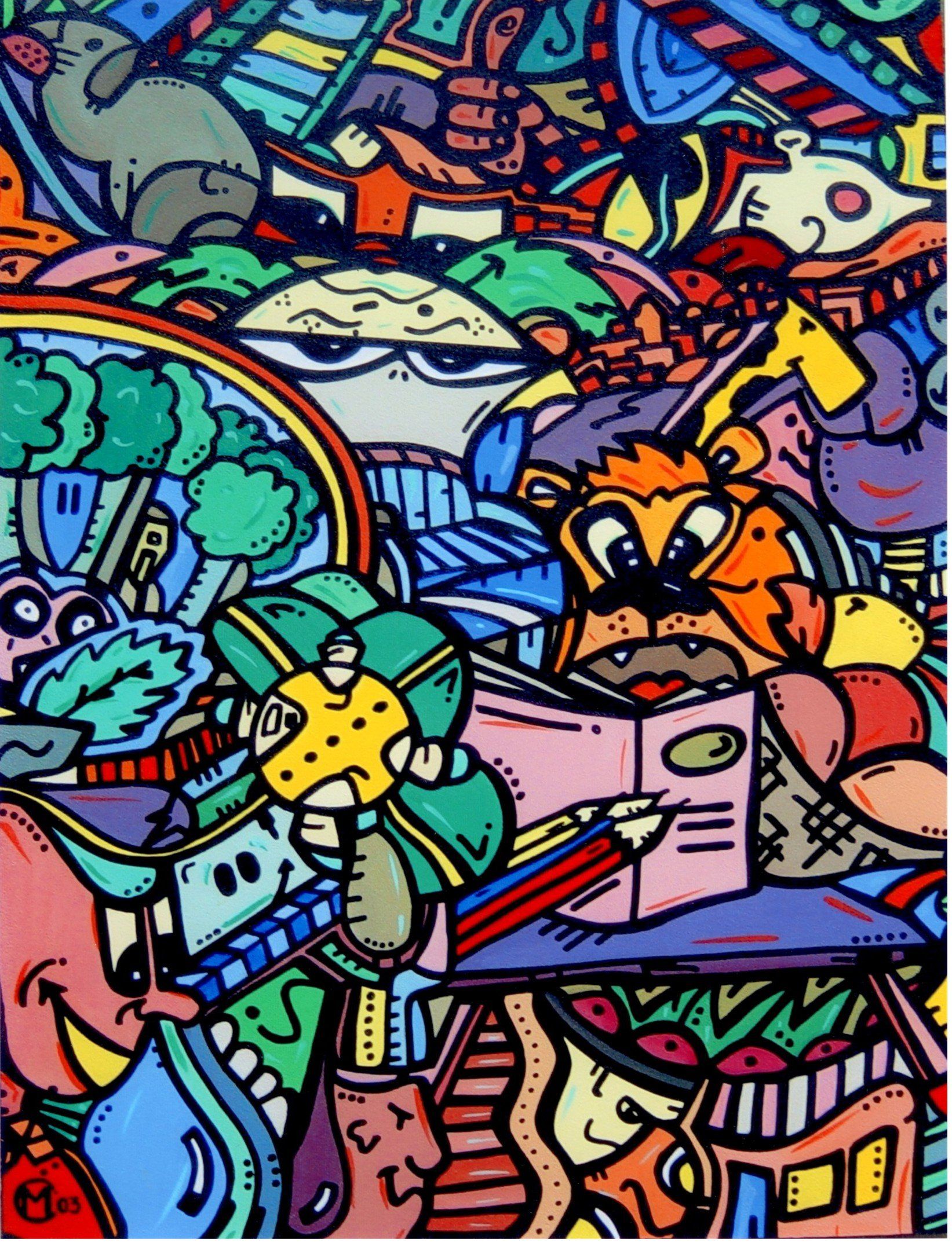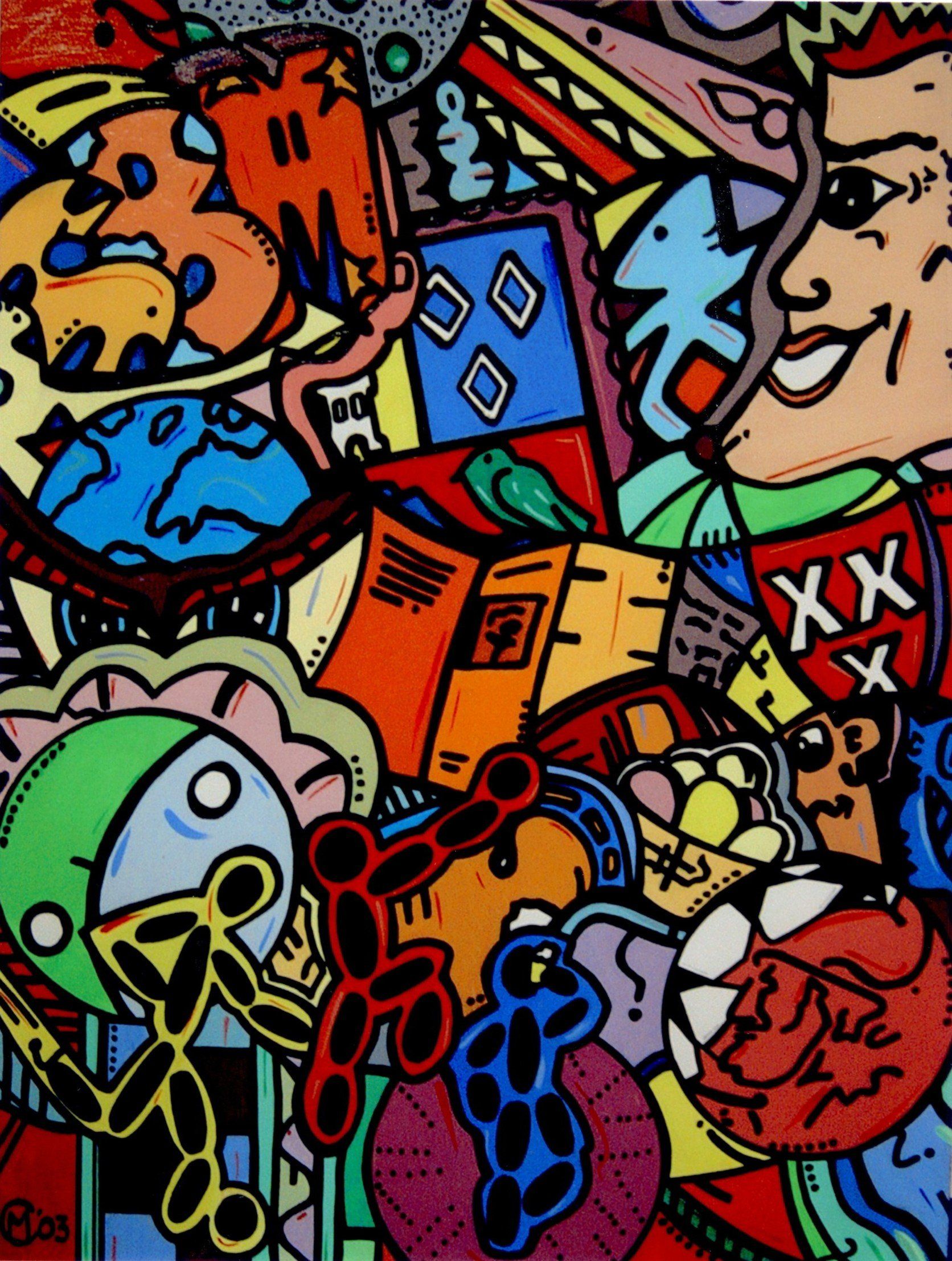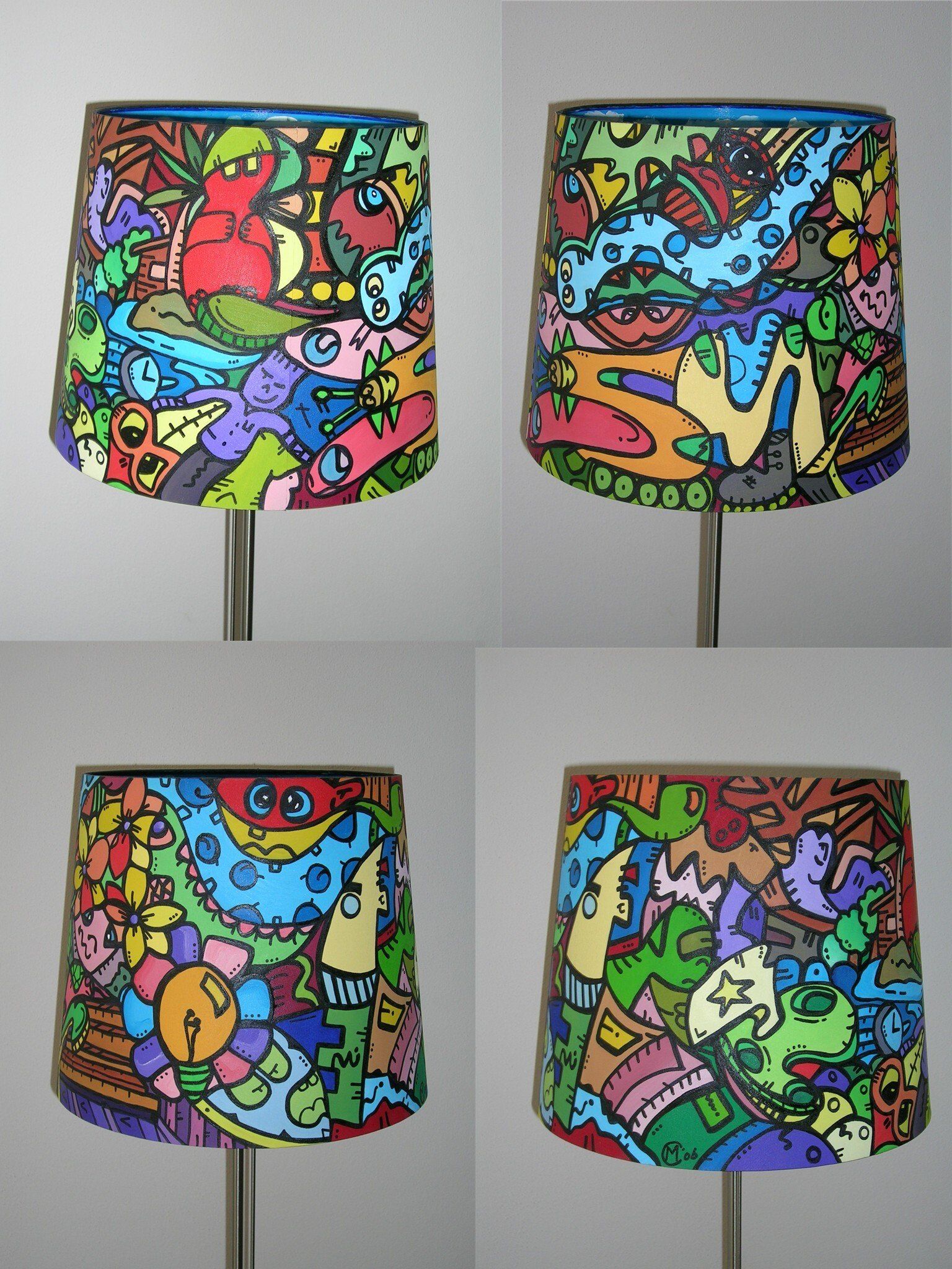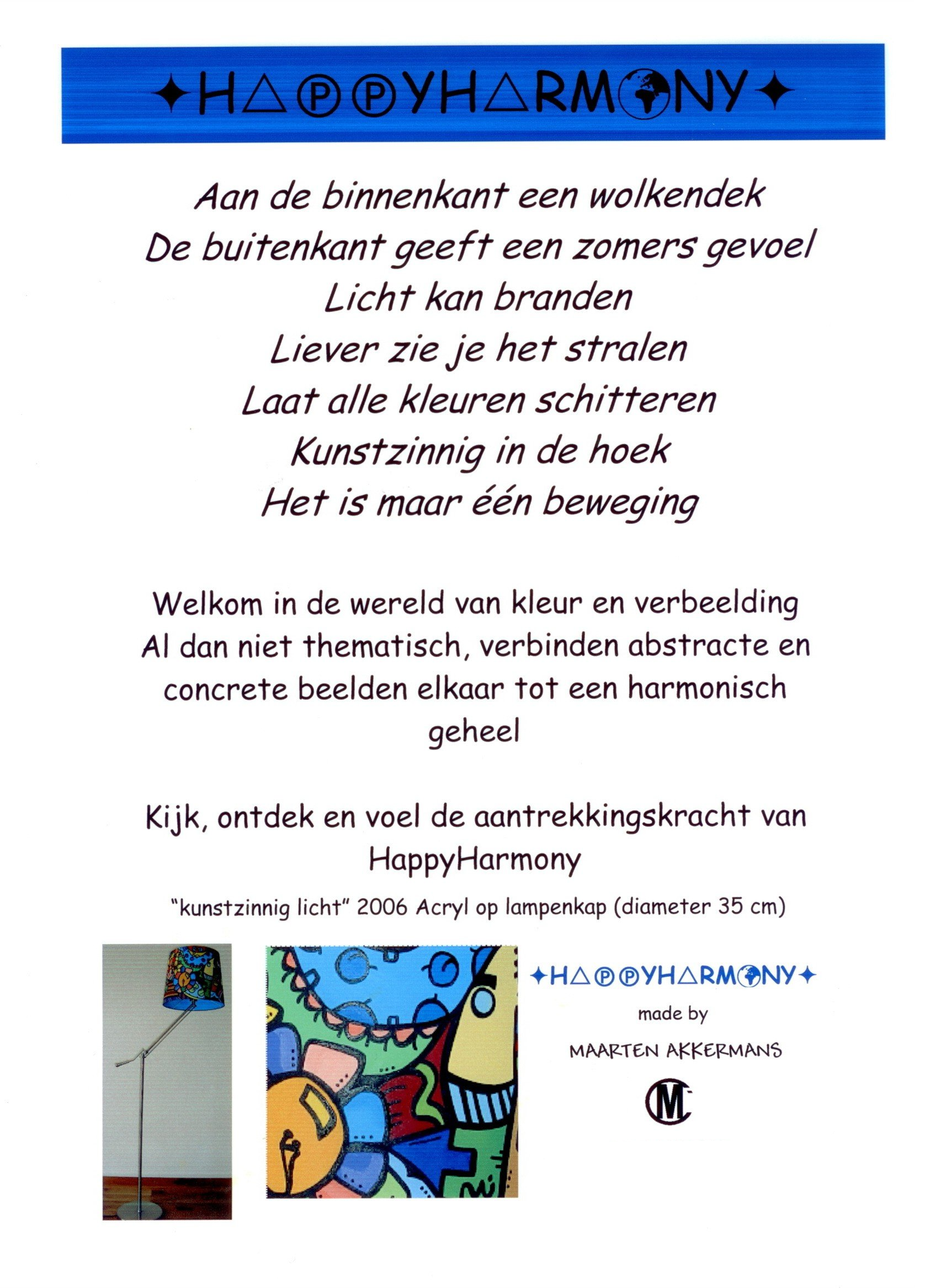 In 1998 heb ik van HappyHarmony mijn Pabo afstudeerproject voor het vak tekenen gemaakt. Naast de zwarte lijnen, had het schilderij dit keer een onderwerp en werd er kleur, heel veel kleur aan toegevoegd. In de jaren 1998 tot aan 2008 heb ik diverse werken gemaakt. Een aantal ervan was in opdracht van mensen die graag een persoonlijk schilderij (soms een lampenkap) wilden.